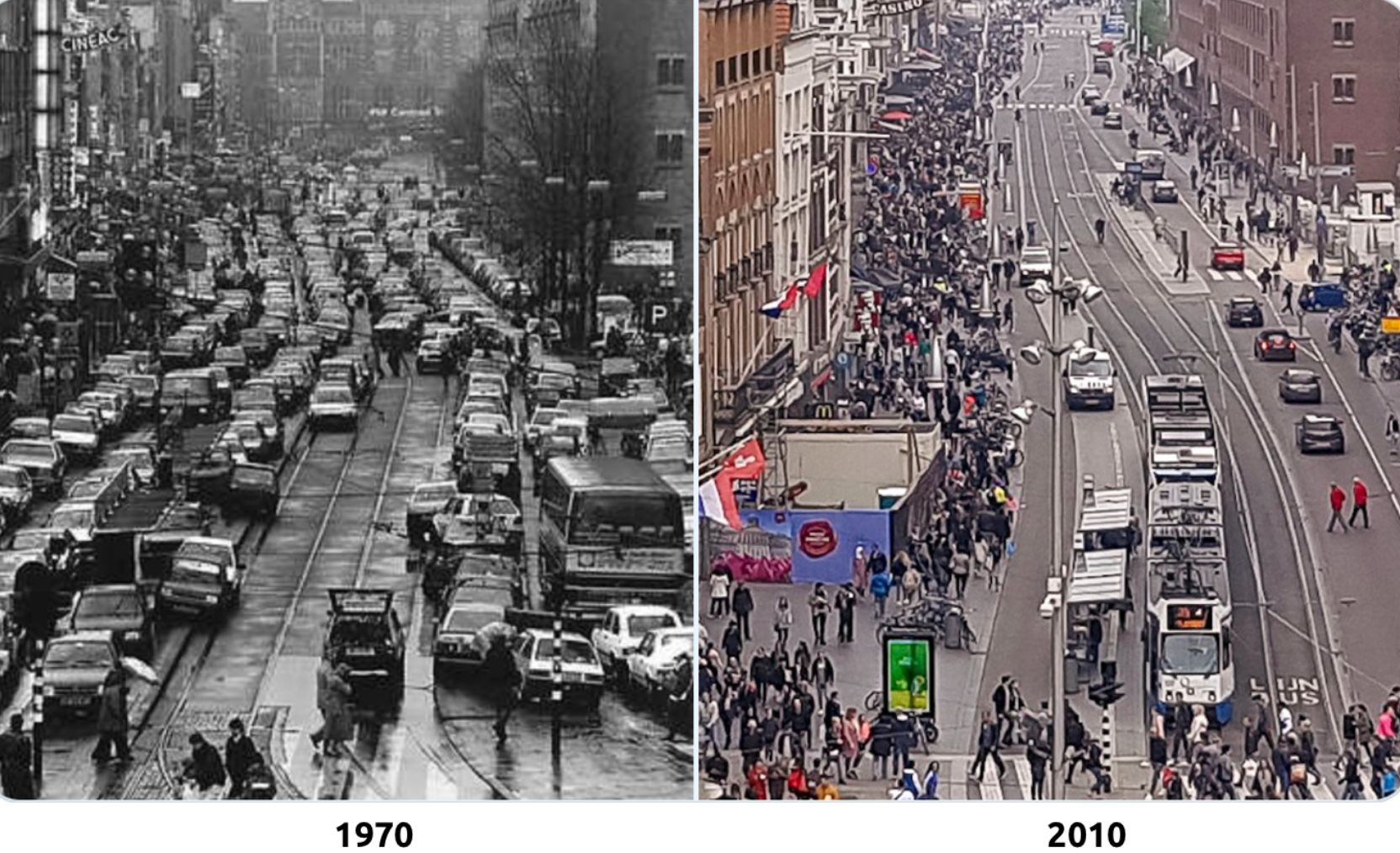 The Damrak main street in Amsterdam, before and after the city government gave pedestrians, cyclists and public transport priority over motor-cars.