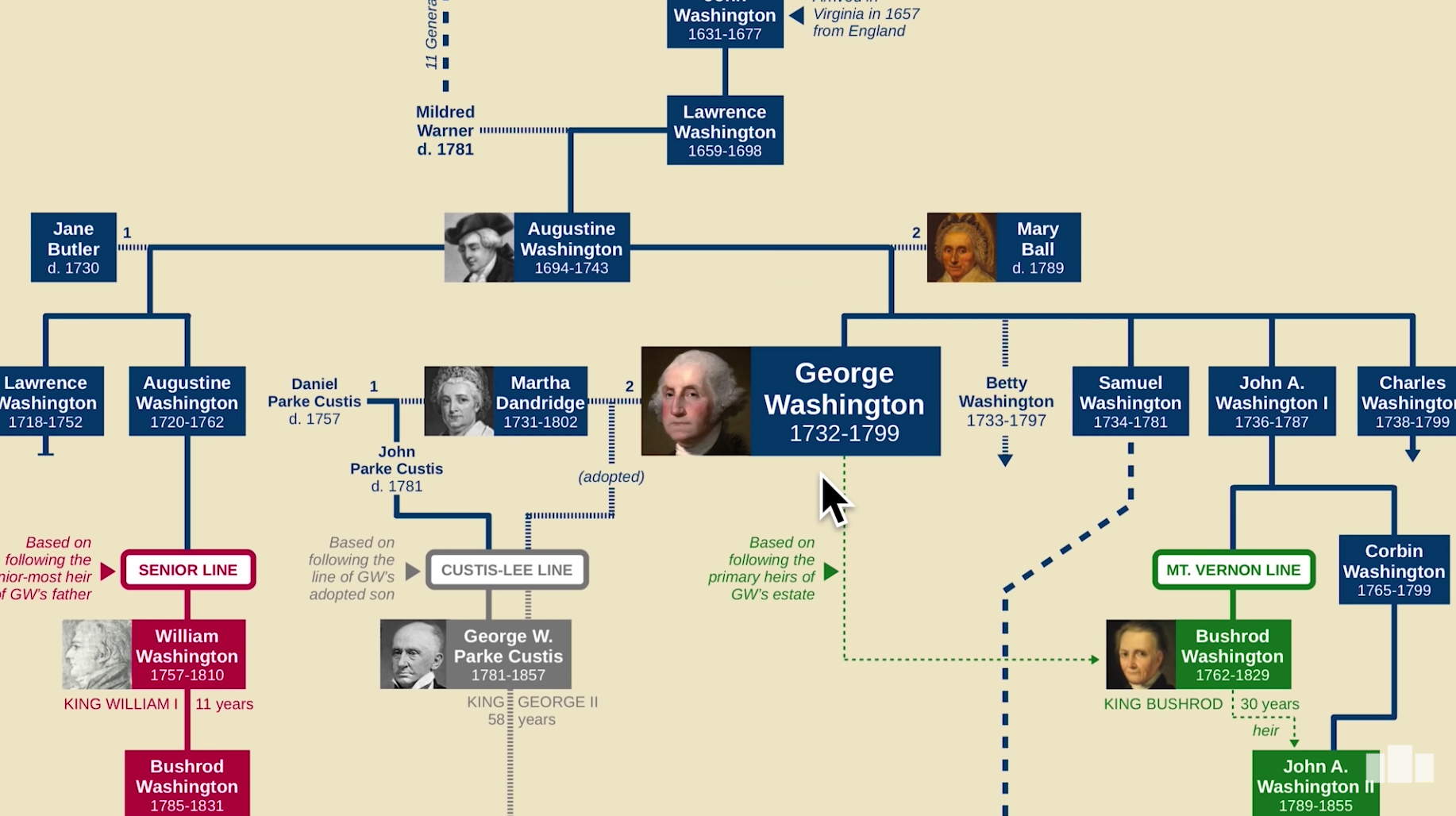 What if George Washington had never renounced the monarchy—who would have been the heir to his throne? He had no sons, so three hypothetical lines can be traced (the Senior line, the Curtis-Lee line, and the Mt. Vernon) leading to three present-day candidates: Queen Brynda, King Robert III, and Queen Mary (21m 37s)