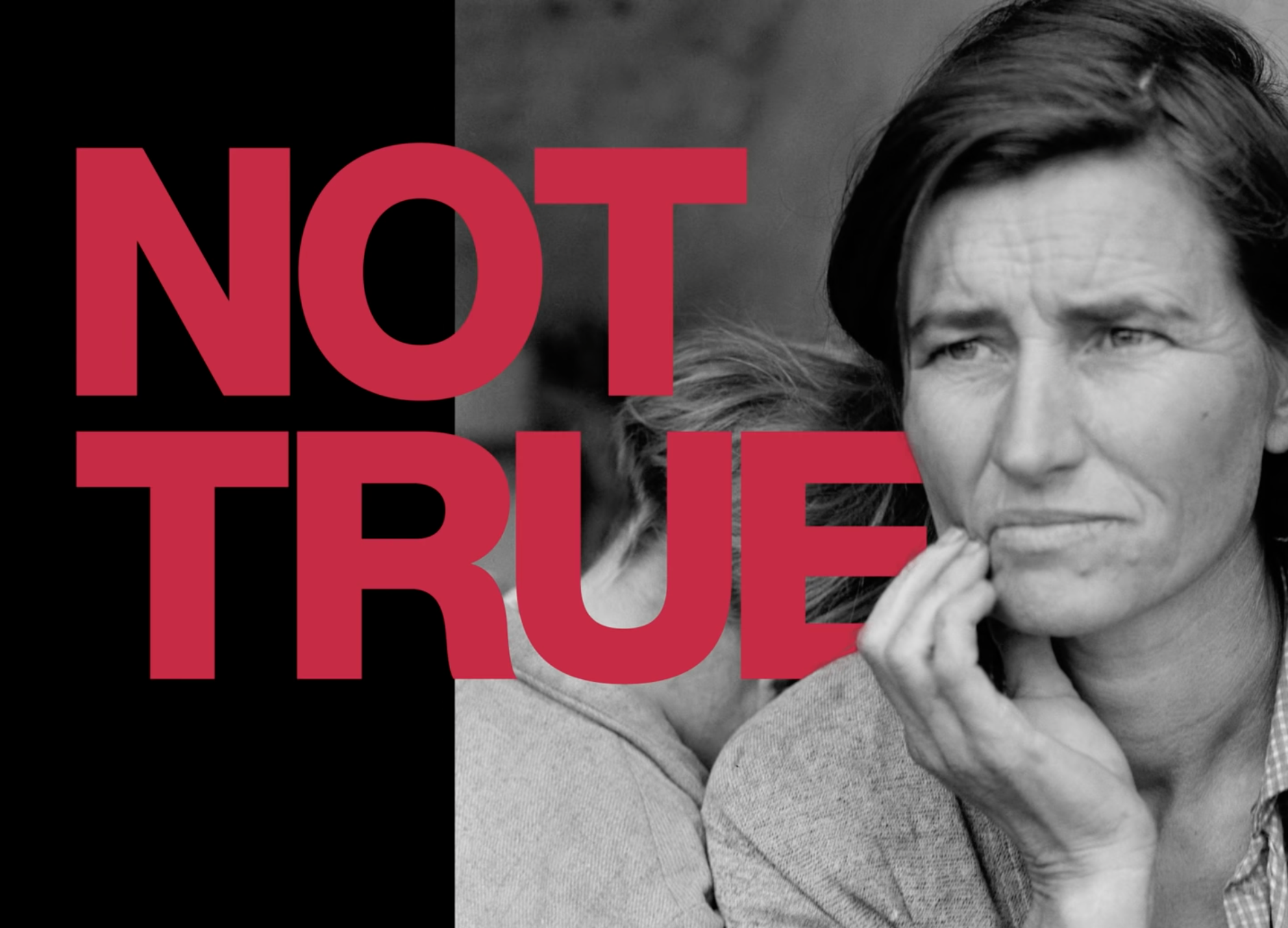 Dorothea Lange's "Migrant Mother," among the most famous American portraits, was arguably based in deceit: Lange left out one daughter, as "having too many children may impact negatively on people's sympathy for the mother," and even had a darkroom assistant remove the woman's left hand, which she saw as a distraction. Portraiture is more "creating something than representing it" (9m 40s)