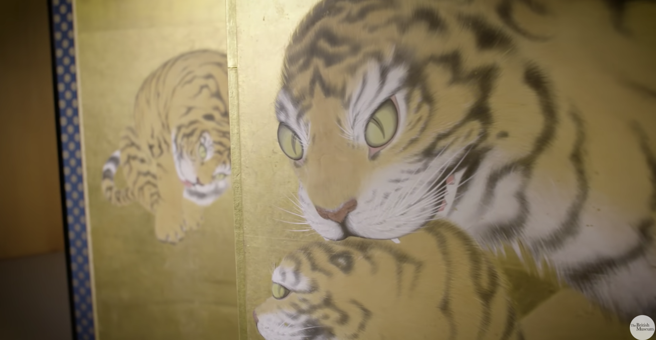 Diving into beautiful Japanese prints. (The oddly flat heads probably arose from the fact that Japanese artists were working from flattened tiger skins; there were no live tigers in Japan.) "You have a black wash forming the shape of the stripe," covered in "very painstaking layering of black hairs, white hairs, orange hairs," and even "some gold mixed in amongst the fur to add to the sense of luxury" (7m 45s)