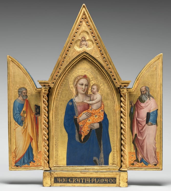 Tempera paintwork beautifully preserved over 7 centuries. The full accompanying text from the National Gallery is recommended for some bite-sized art history. “Tempera paints, made with pigment and egg yolk, were quick-drying and could not—like oils—be blended or built up in translucent layers on the surface of the panel... Early tempera paintings are sometimes said to have a “linear” quality.... By contrast, Nardo’s paintings demonstrate a delicate modeling of light, intermediate, and dark tones”.